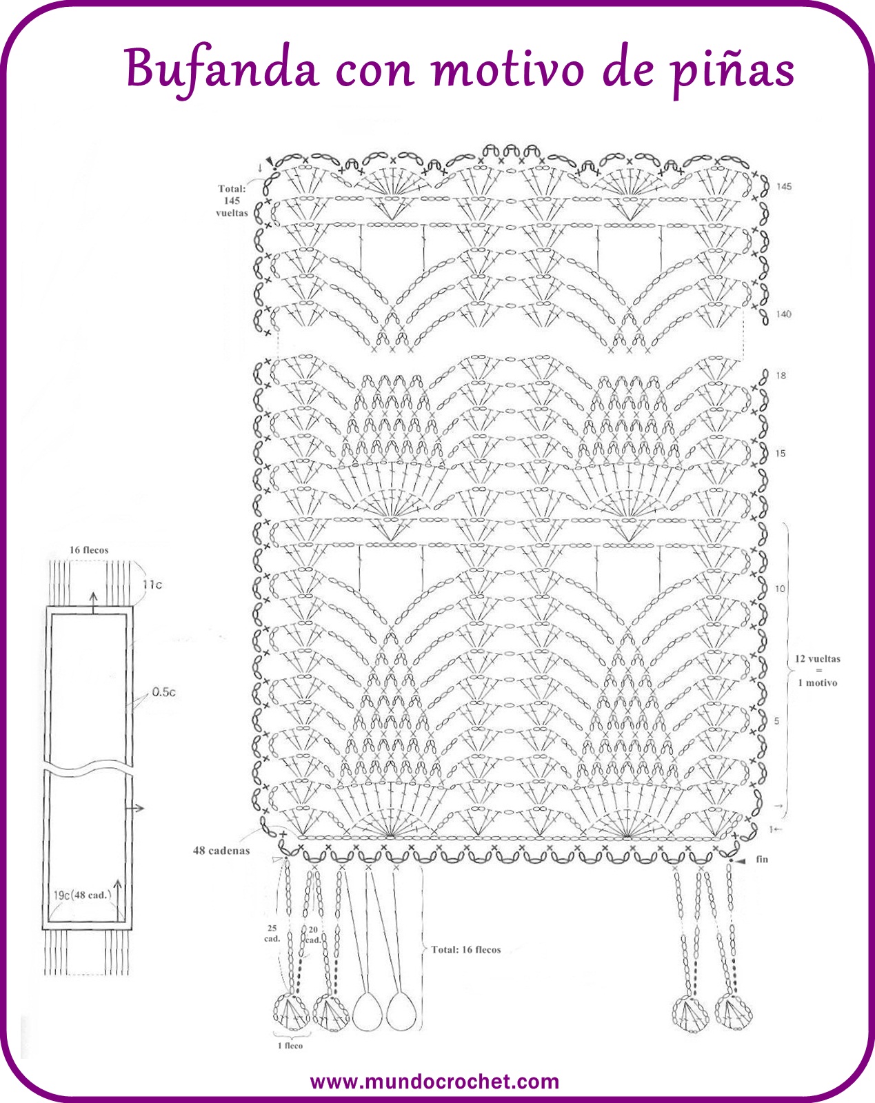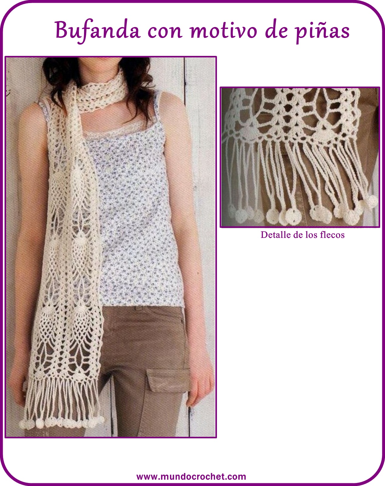 En esta ocasión quiero dejarles 3 patrones de bufandas: una bufanda ideal para principiantes, ya que se teje en forma recta empleando puntos básico; una intermedia tejida en redondo, que da un efecto de espiral al finalizarla; y una con motivos de piñas para aquellas que ya tienen un poco más de práctica.