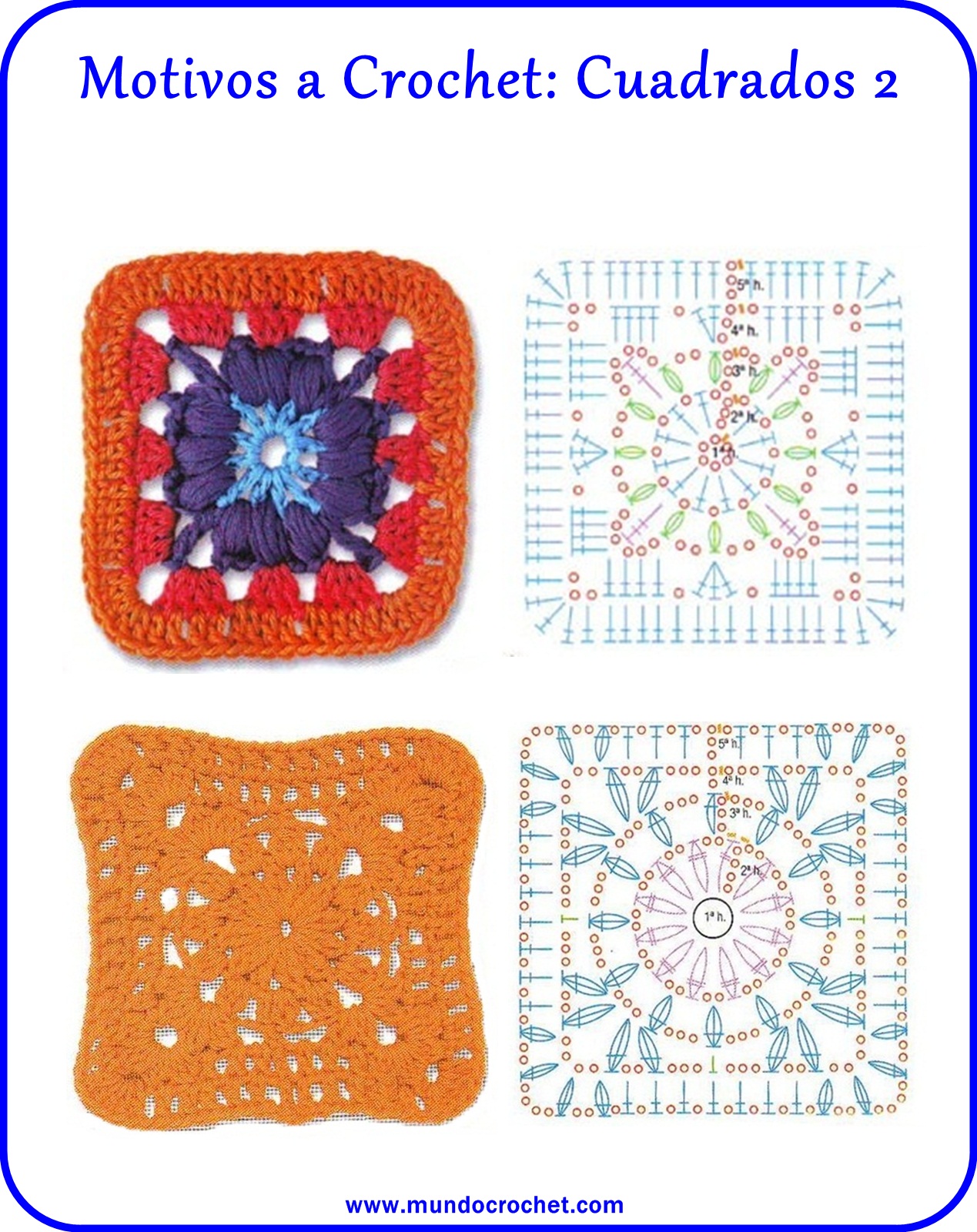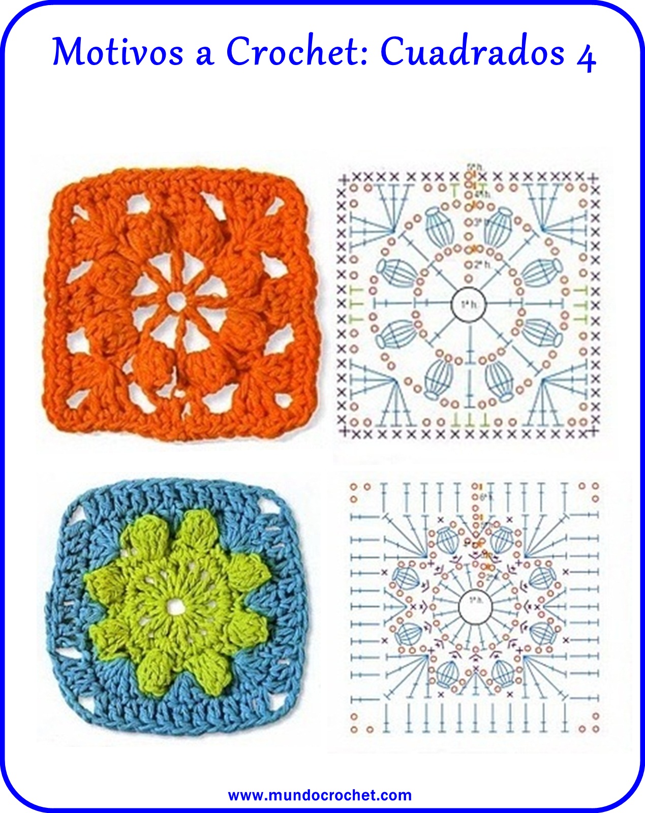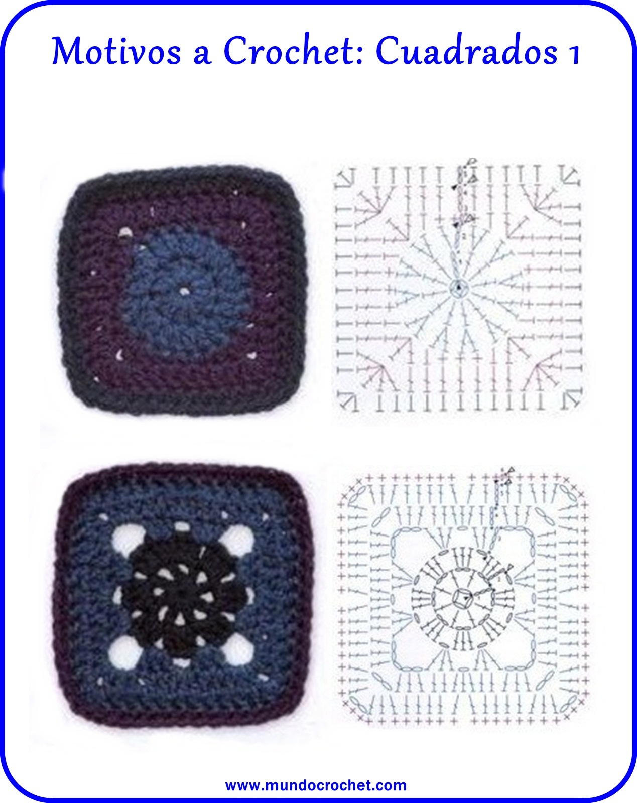 Les dejo 8 motivos que constituyen una variante del cuadrado tradicional, ya que se comienza tejiendo un círculo para luego transformarlo en un cuadrado.