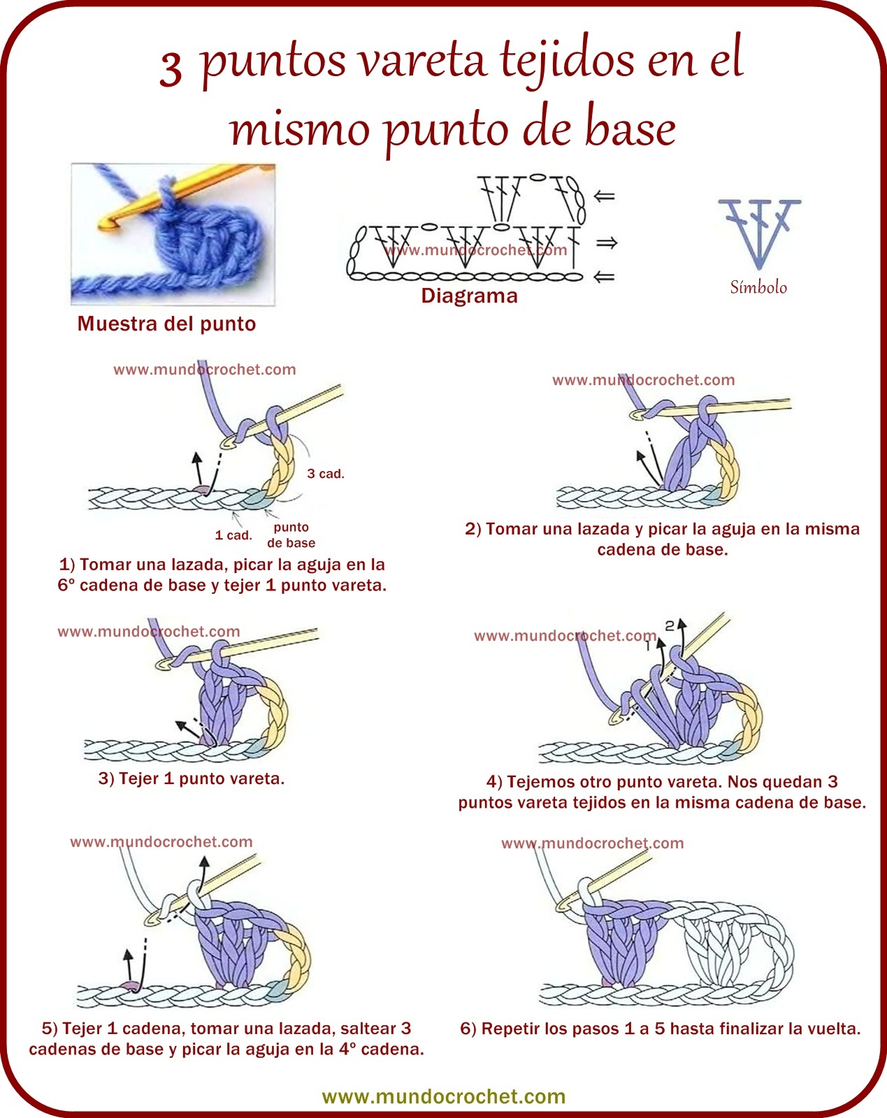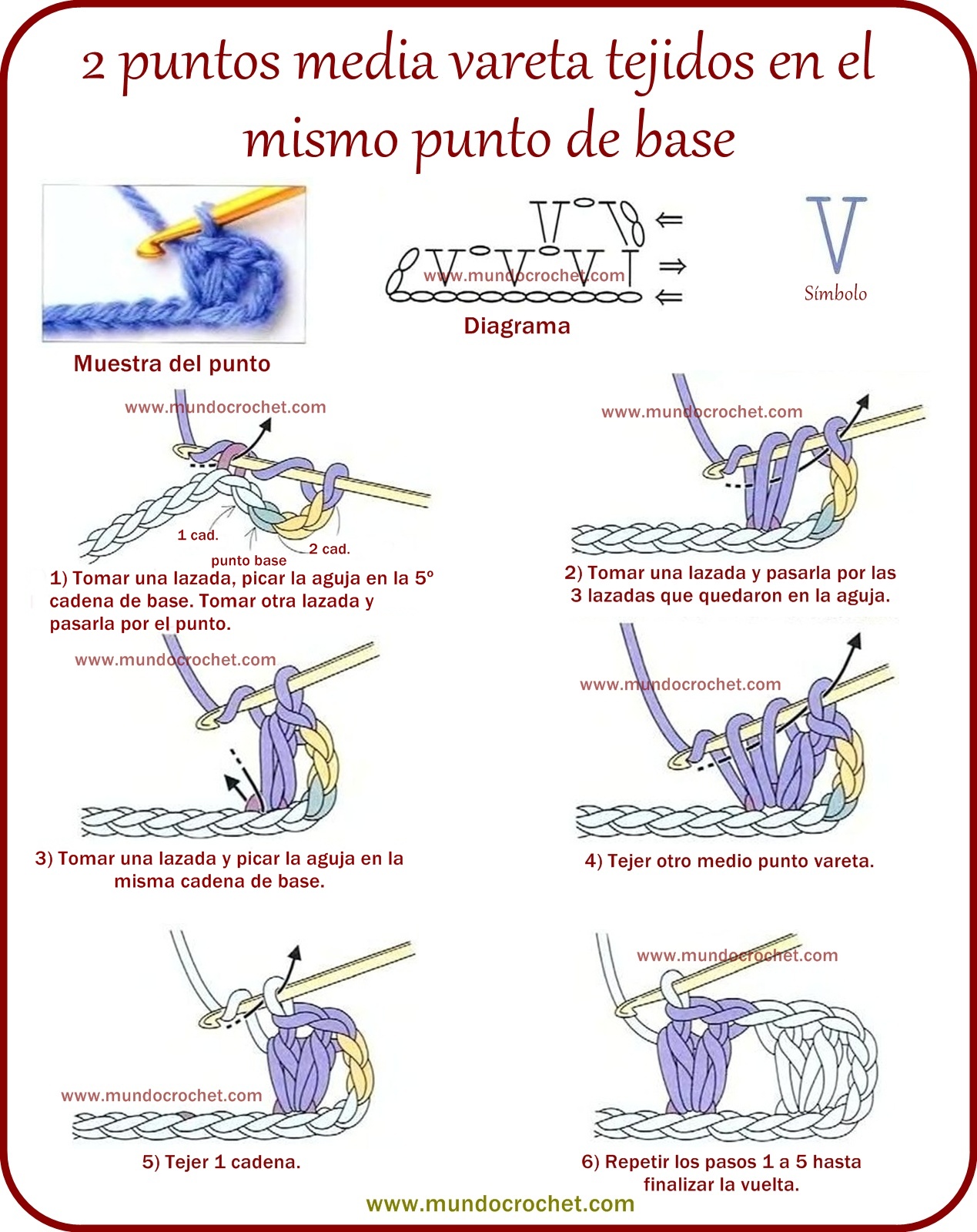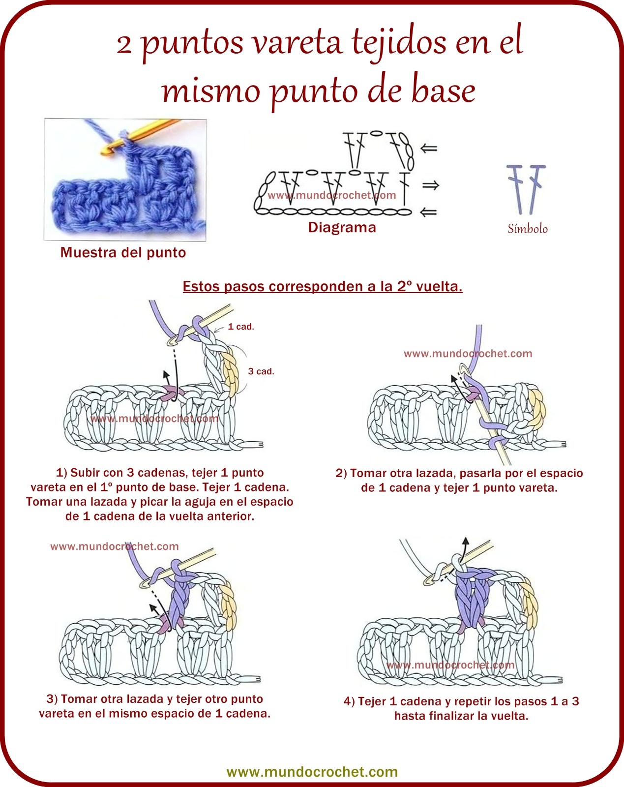 Este punto que les dejo hoy es muy parecido al visto anteriormente y cumple con la misma función: realizar aumentos de a dos puntos (además de poder emplearse en puntos fantasía). La diferencia radica en que este punto, en vez de lograr el aumento tejiendo 3 medio puntos en el mismo punto de base, logra el aumento tejiendo 2 medio puntos separados por una cadena. En la próxima vuelta se tejerá un punto en cada medio punto de la vuelta anterior y otro punto en el espacio de una cadena.