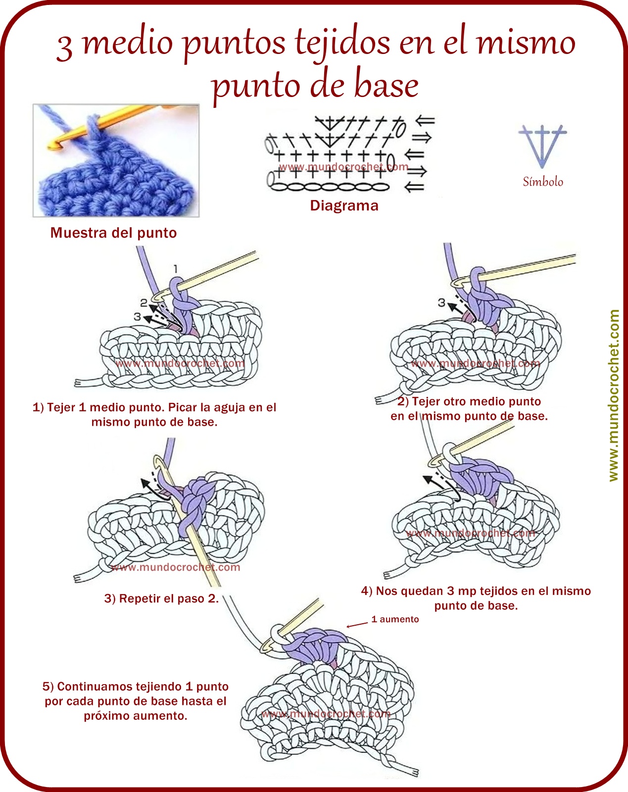 4º vuelta) Tejemos 1 punto en los 2 primeros puntos y 2 puntos en el 3º punto de la vuelta anterior.