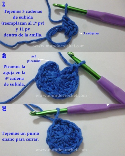 *Punto vareta: vamos a tejer 3 cadenas para subir (cuentan como 1º punto) y tejemos 11 pv dentro del anillo.
