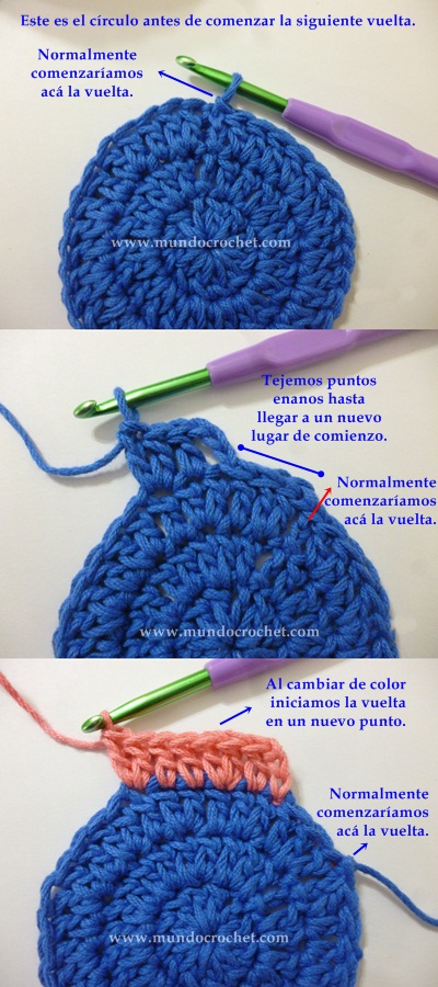 2-Emplear diferentes puntos de inicio. Consiste en comenzar cada vuelta tejiendo las cadenas habituales pero en un punto diferente. Cuando estamos tejiendo en varios colores basta con cortar la hebra y rematar y comenzar la nueva vuelta con el nuevo color en otro punto del círculo. Si estamos tejiendo en un mismo color, tejemos puntos enanos hasta alcanzar un nuevo punto y ahí tejemos las cadenas de subida.