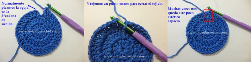 La forma más común de cerrar el tejido es tejer un punto enano en las cadenas de subida o en el 1º punto de la vuelta, sin embargo muchas veces esta unión deja un espacio poco estético que queda particularmente feo cuando tejemos gorros.