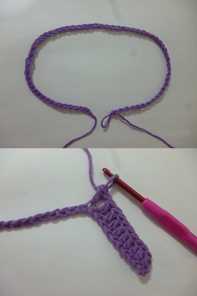 1-Tejer las cadenas de inicio con una aguja más pequeña que la que estamos usando.