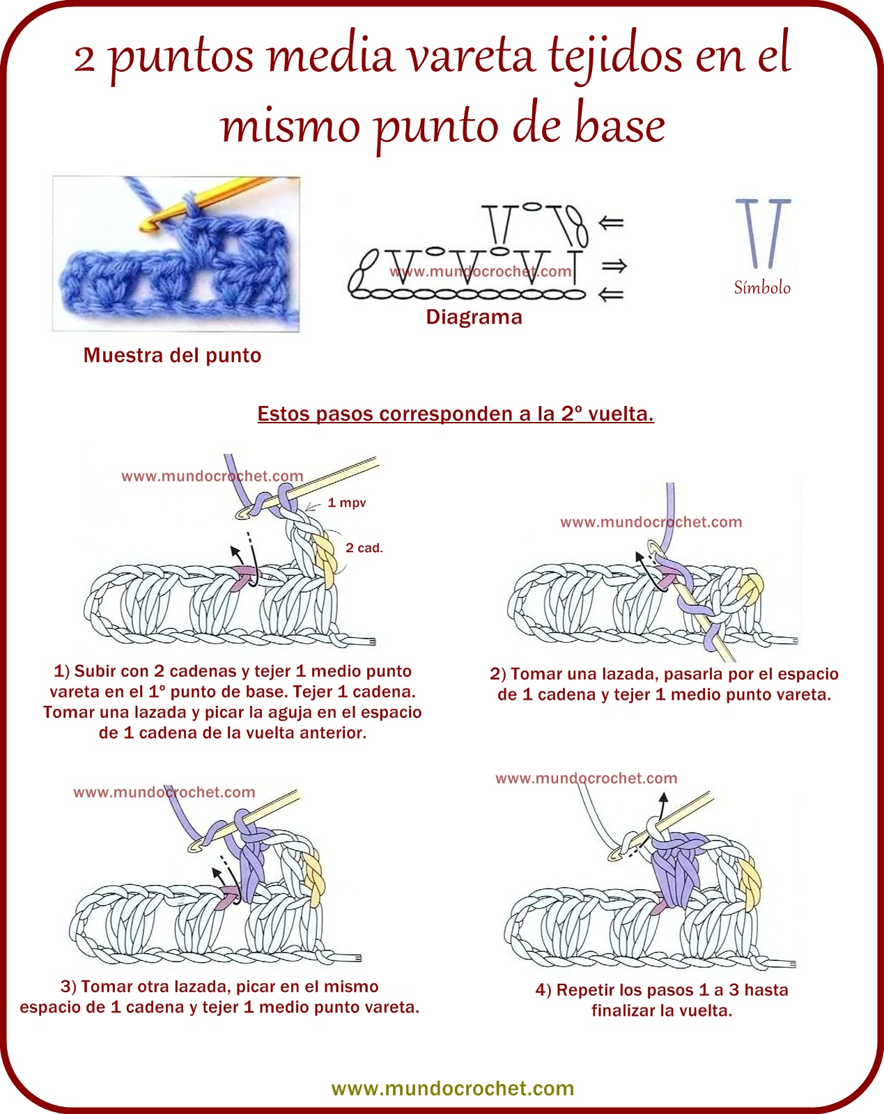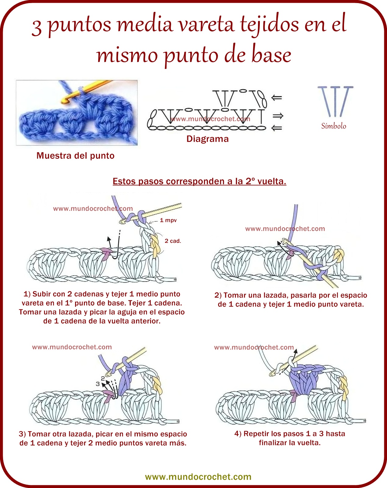 3º vuelta) Tejemos 1 punto en el 1º punto y 2 puntos en el 2º punto de la vuelta anterior.