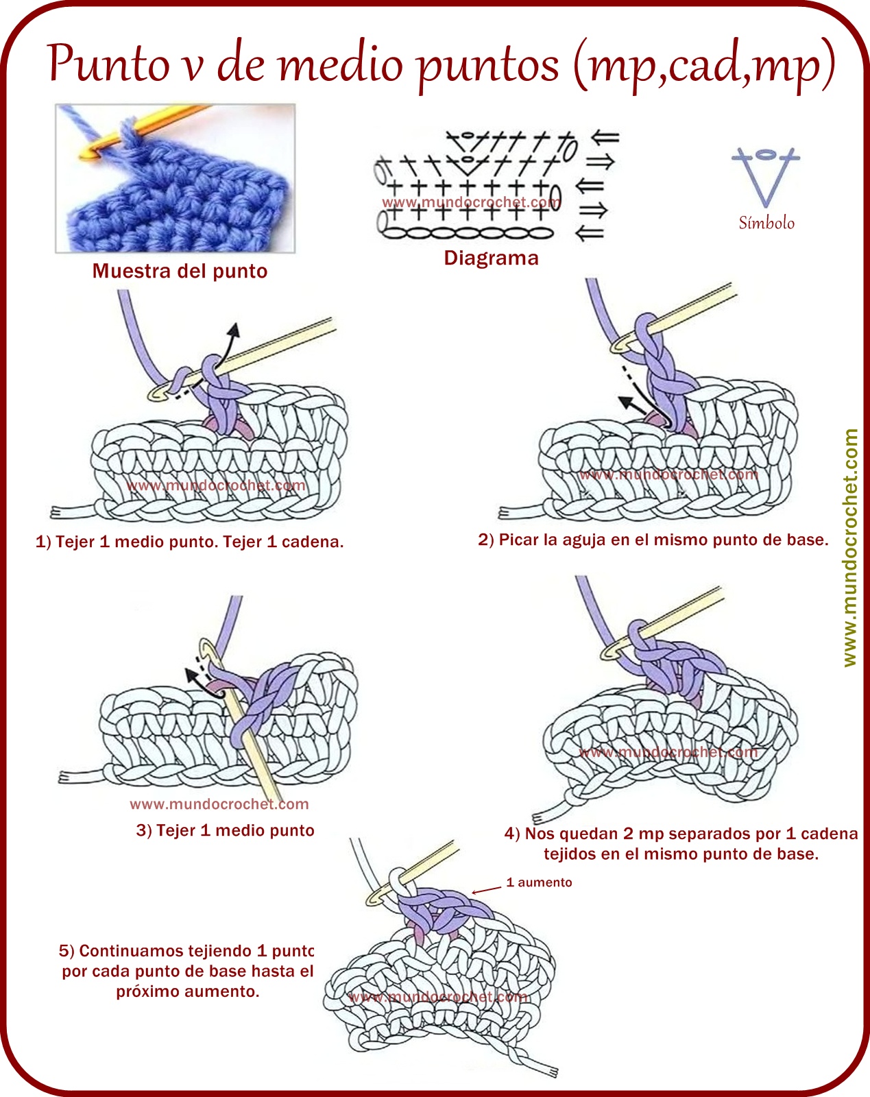 *Medio punto: vamos a tejer 1 cadena para subir (NO cuenta como 1º punto) y tejemos 6 mp dentro del anillo.