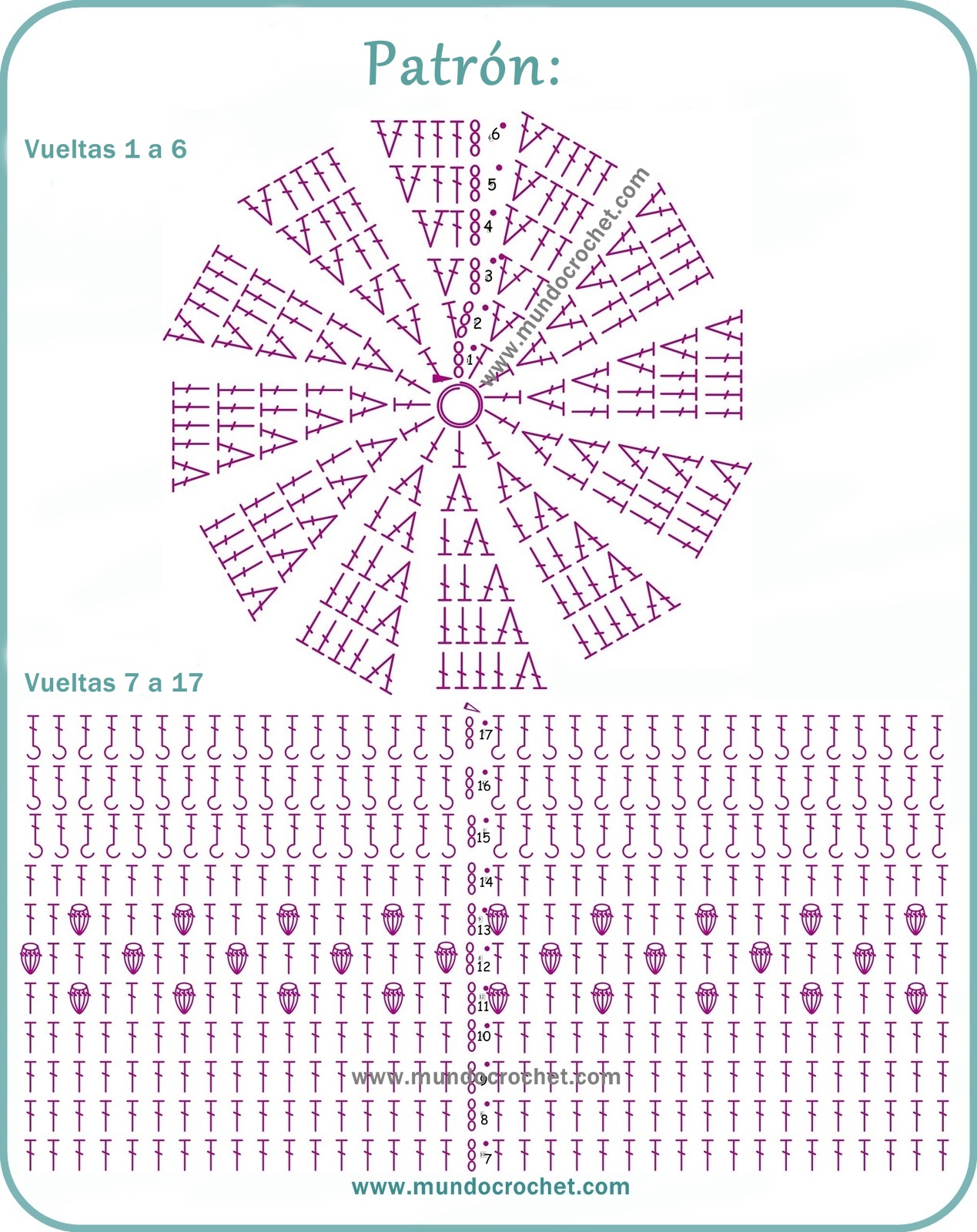 7 a 10) Subir con 3 cadenas y tejer 1 pv en cada punto de base. Cerrar con un punto enano. Total: 72 pv.