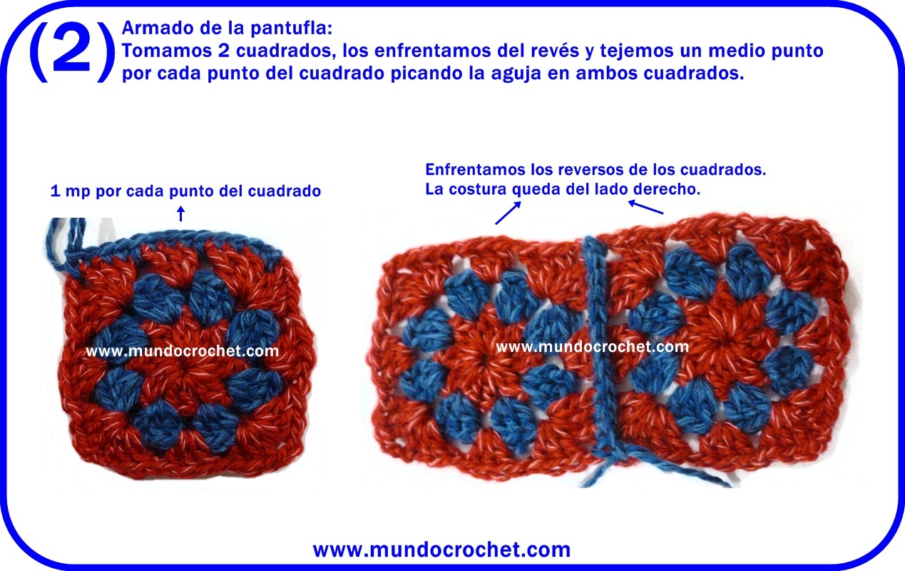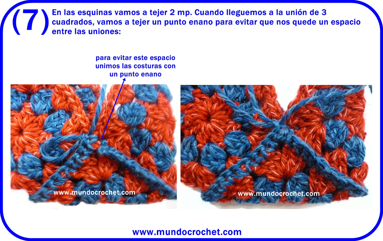 2-Subimos con 1 cad. y tejemos (1 mp, 2 mv, 1 mp) en cada arco de 4 cad. de la vuelta anterior. En los vértices tejer 3 cad. para girar y continuar. Cerrar con un punto enano tejido en el 1º mp de la vuelta.