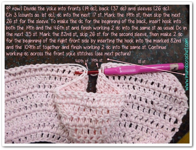 In the row 11 we will divide the yoke into: fronts (18 dc each), sleeves (27 dc each) and back (36 dc).