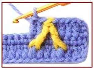 ![]() | medio punto tomado por delante tomado una vuelta más abajo | front post single crochet bellow | ||