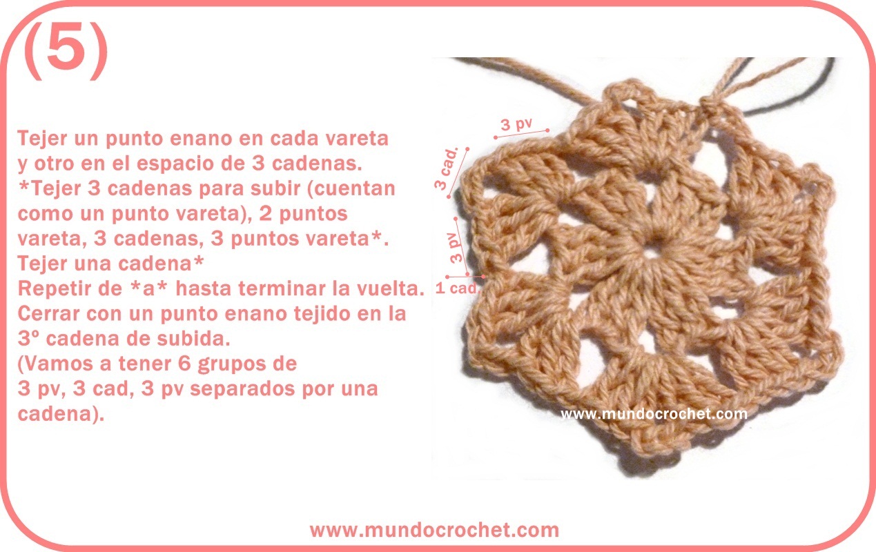 Vuelta 25) Subir con 1 cad. y tejer 1 mp en cada punto de la vuelta anterior. En los extremos (vértices) tejer 2 mp. Cerrar con un punto enano tomado del 1º mp de la vuelta.